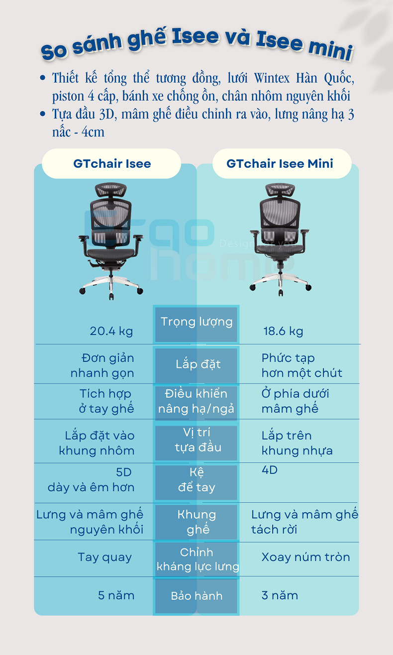 Để thỏa mãn tâm lý người dùng, thương hiệu GT Chair đã ra mắt phiên bản ghế công thái học I-see Mini, là phiên bản rút gọn của I-see, thiết kế tương tự nhưng giống và khác nhau các tính năng. Là mẫu ghế tầm trung mới nhất của GT Chair – thương hiệu sản xuất ghế Công thái học hàng đầu thế giới. Ghế form ôm, phù hợp với khách hàng có vóc dáng trung bình và nhỏ.